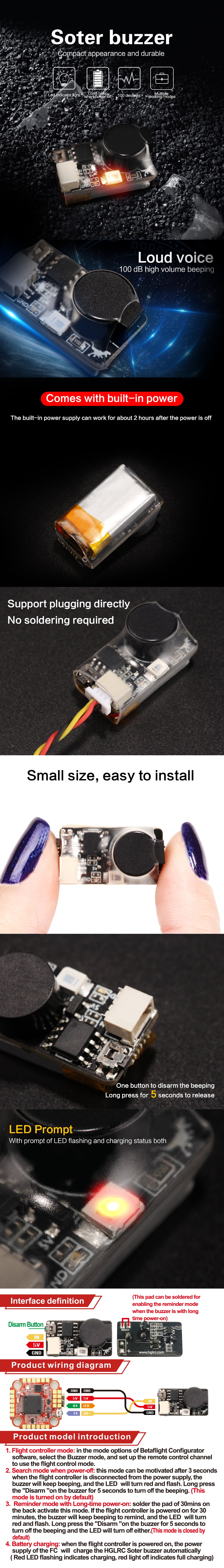 HGLRC Soter is compatible with all Betaflight and Cleanflight flight controllers. Just connect to the buzzer interface of the flight controller and it will work. When the flight controller wiring is correct, the multi-rotor aircraft is powered on and the flight controller power supply will automatically charge the HGLRC Soter ( Red LED flashing indicates that the buzzer is being charged, red LED off means charging is complete.)