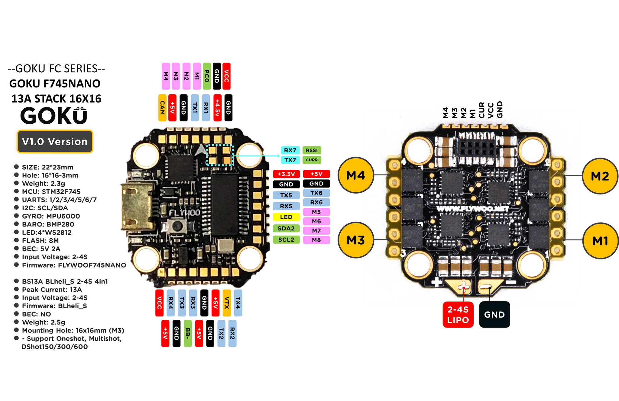 It is specifically designed to be pin mounted to the Goku BS13A / 20A / 35A 4in1 16x16 ESCs but can also be soldered via pads. The programmable WS2812 LED on each corner provide low profile lighting for this tiny FC.