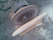 Очень удобен для быстрого изготовления болванок. Основа - двигатель, например от точильного круга ~1кВт 2800 Об/мин. Диск – МДФ 10мм, вырезан лобзиком и обточен шкуркой по торцу прямо на вращающемся двигателе. Шкурка (№120-180) – клеится моментом. На основании закреплена площадка для опоры обрабатываемых деталей. Работать лучше на улице, в строительных перчатках и в защитных очках, деталь имеет свойства иногда улетать на десяток метров.